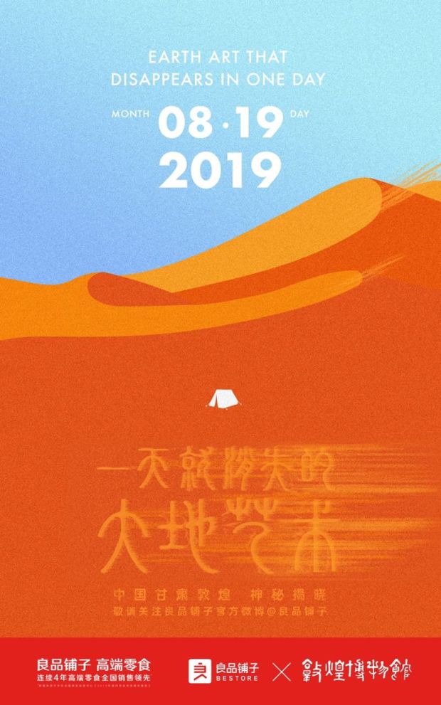 8月19日,良品鋪?zhàn)舆€將在敦煌沙漠演繹了一場(chǎng)“只存在一天的大地藝術(shù)”。敦煌沙漠上會(huì)出現(xiàn)一幅精美的大地沙畫(huà),忽然風(fēng)沙起,美好的景象頃刻間流逝。年輕的藝術(shù)家們近一周的創(chuàng)作,用“沙畫(huà)”的形式再現(xiàn)經(jīng)典敦煌壁畫(huà),希望通過(guò)再現(xiàn)沙畫(huà)風(fēng)化消逝的過(guò)程呼吁更多關(guān)注和保護(hù)敦煌文化。